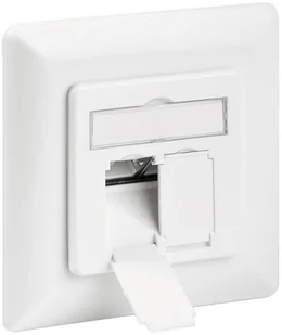 Puszka podtynkowa CAT 6a, biała 2x gniazdo sieciowe RJ45, ekranowane - CAT 6a klasy EA do 500 MHz - odpowiednia dla 10 Gbit Ethernet / obsługuje aplikacje PoE+ (IEEE 802. 3at) - centralna płyta ze zintegrowaną klapką chroniącą przed kurzem - ekranowane gniazda RJ45, 8P8C - okienko z wkładką do etykietowania - pełne ekranowanie gniazd RJ45 i pasków LSA dzięki w pełni zamkniętej metalowej obudowie odlewanej ciśnieniowo - kompatybilny z projektem: