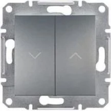 Łącznik żaluzjowy w kolorze stalowym, serii Asfora, marki Schneider Electric, o numerze katalogowym EPH1300562. Podłączenie przewodów za pomocą zacisków bezgwintowych. Długie i solidne pazury utrzymywane są za pomocą metalowych prowadnic w pozycji pionowej, co ułatwia montaż oraz zwiększa bezpieczeństwo podczas mocowania mechanizmu w puszce instalacyjnej. Mechanizm posiada czytelny schemat oraz oznaczenie zacisków ułatwiające podłączenie. Dodatkowo, solidna ramka montażowa wykonana z galwanizowanego metalu posiada nacięcia ułatwiające pozycjonowanie.