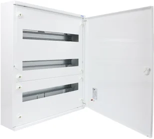 Rozdzielnica BF-O-3/72-P natynkowa 3x24 moduły drzwi metalowe IP30 285345, firmy Eaton Electric. Rozdzielnica natynkowa 72 modułowa. Posiada 3 rzędy, po 24 moduły każdy. Wykonana jest z blachy stalowej malowanej proszkowo, w kolorze białym. Komplet zawiera: szyny nośne, osłony, zaciski N i PE, drzwi w komplecie. Opcjonalnie istnieje możliwość zamontowania zamka z kluczykiem.
