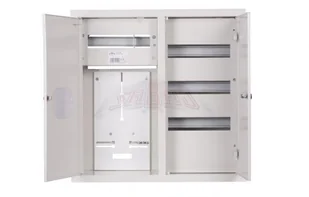 Metalowa podtynkowa rozdzielnica typu RL, przeznaczona do zainstalowania licznika trójfazowego oraz czterdziestu ośmiu zabezpieczeń.
