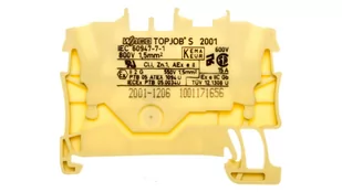 Dane techniczne: AWG max.: 14 $345 AWG min.: 22 $346 Długość produktu: 4.20 mm $347 Ilość PIN: 2 $348 Ilość pin w rzędzie: 2 $349 Ilość rzędów: 1 $350 Kolor: żółty $351 Maksymalna długość zacisku: 9 mm $352 Maksymalne pole przekroju poprzecznego przewodu elastycznego: 2.50 mm$353 $354 Maksymalne pole przekroju poprzecznego przewodu sztywnego: 1.50 mm$355 $356 Minimalne pole przekroju poprzecznego przewodu elastycznego: 0.25 mm$357 $358 Minimalne pole przekroju poprzecznego przewodu sztywnego: 0.25 mm$359 $360 Napięcie znamionowe: 800 V $361 Numer części producenta: 2001-1206 $362 Produkty przemysłowe: tak $363 Prąd znamionowy: 18 A $364 Rodzaj (typ producenta): 2001-1206 $365 Rodzaj złącza: Terminal przepustowy $366 Szerokość klemy: 4.20 mm $367 Szerokość produktu: 4.20 mm $368 Waga: 3.533 g $369 Wysokość produktu: 32.90 mm $370 Właściwości klem zaciskowych: Odpowiedni do Ex e II $371 Zawartość: 100 szt.