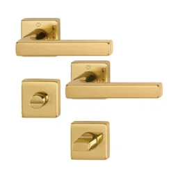 Dallas to klamka wyróżniająca się geometrycznym kształtem i kwadratowym szyldem. Wykonana z mosiądzu dostępna jest w pięknym złotym kolorze . Szukasz okuć drzwiowych o nowoczesnym designie? Sprawdź serię klamek Dallas z oferty naszego sklepu! Producentem klamki Dallas jest renomowana marka HOPPE , słynąca z produkcji zaawansowanych technologicznie okuć drzwiowych i okiennych. Producent oferuje przy tym aż 10-letnią gwarancję na działanie mechanizmu wszystkich swoich klamek do okien i drzwi (pod warunkiem stosowania się do zasad dot. montażu i konserwacji). Dzięki mechanizmowi szybkozłącza klamkę drzwiową możesz zainstalować jednym prostym ruchem .