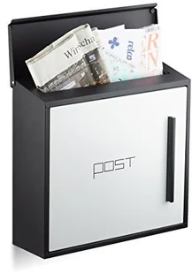 x szer. x gł. : ok. 32 x 34 x 9 cm - Materiał: Metal (stal, ocynkowana, malowana proszkowo) - Kolory: Biały, żółty, czerwony lub zielony - Pokrywa i boki są czarne Nowoczesna skrzynka na listy z zamkiem - Metaliczny design - Wyraźne, geometryczne kształty - Praktyczny uchwyt - Nowoczesny napis POST pośrodku - Zamykana na klucz, w tym klucz zapasowy Naścienna skrzynka na listy w wielu kolorach - Wybierz swój ulubiony kolor - Elegancka i stylowa mieszanka kolorów - Duża szczelina wrzutowa, odpowiednia również dla formatu DIN A4 - Składana pokrywa chroniąca przed wodą - Ze śrubami i kołkami do montażu na ścianie - Odległość między otworami montażowymi: poziomo 23 cm, pionowo 17 cm Zakres dostawy - Skrzynka na listy - 2 klucze - Śruby, kołki rozporowe, gumowa podkładka dystansowa - Elementy dekoracyjne nie wchodzą w zakres dostawy
