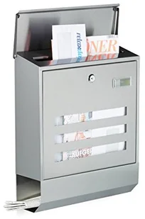 x szer. x głęb. : ok. 9 x 34,5 x 10,5 cm u góry (7,5 cm u dołu) - Wymiary szczeliny na listy szer. x głęb. : ok. 30 x 3 cm - Wymiary wewnętrznej przegródki wys. x szer. x gł. : ok. 32 x 34 x 9 cm - Materiał: całkowicie stal nierdzewna, szczotkowana Designerska skrzynka na listy ze stali nierdzewnej z tabliczką znamionową - Nowoczesny metaliczny design - Okienko na tabliczkę znamionową w prawym górnym rogu - Nazwa jest przyklejona od wewnątrz - Zamykana na klucz, w tym klucz zapasowy - 3 stylowe paski jako okienko podglądu - Gumowe przekładki zapewniają delikatne i ciche zamykanie Naścienna skrzynka na listy z miejscem na gazety i tabliczką znamionową - Rolka na gazety do czasopism, katalogów i wielu innych przedmiotów - Duża szczelina wrzutowa, odpowiednia również dla formatu DIN A4 - Składana pokrywa chroniąca przed wodą - Ze śrubami i kołkami do montażu na ścianie - Rozstaw otworów montażowych: poziomy 23 cm, pionowy 17 cm Zakres dostawy - Skrzynka na listy - 2 klucze - Śruby, kołki, gumowa podkładka dystansowa - Elementy dekoracyjne nie wchodzą w zakres dostawy