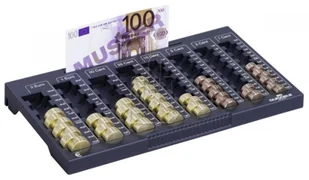 Przejrzyste opisanie i uporządkowanie przegródek na monety umożliwia dobry podgląd na ilość pieniędzy w podstawce. Banknoty można włożyć do schowków znajdujących się na zewnętrznej krawędzi półki. Wgłębienia służące jako uchwyty po bokach podstawki ułatwiają wyciąganie i wkładanie. Gumowe wsporniki zapobiegają ślizganiu się i chronią dokumenty. _UROBOARD_ L Podstawka na pieniądze _UROBOARD_ L zawiera 8 przegródek na monety EUR oraz centy. Pojemność użytkowa wynosi 233,90 _. Wymiary: 324 x 34 x 190mm (S x W x G).