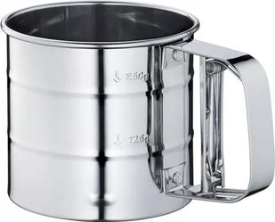 Stalowy kubek z sitkiem do przesiewania niemieckiej firmy Kuchenprofi. W całości wykonany jest ze stali nierdzewnej, co nadje mu wyjątkową trwałość. Wystarczy tylko nacisnąć dżwignie umieszczoną w uchwycie by z łatwością przesiać cukier puder, kakao, mąkę lub inne produkty. Firma Kuchenprofi posiada szeroką gamę wysokiej klasy akcesorii kuchennych.