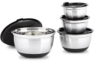 Ten 3- lub 4-częściowy zestaw misek ze stali nierdzewnej to idealne rozwiązanie, aby spełnić swoją pasję do gotowania lub pieczenia. Gumowa podstawa sprawia, że metalowe miski nie ślizgają się. Miski do gotowania sprawdzą się również jako miski do serwowania ponczu lub przekąsek na następnym przyjęciu. Aby zachować aromat i smak świeżo przygotowanego dania, pokrywka chroniąca przed aromatem jest bardzo pomocna. Dzięki praktycznym pokrywkom pojemniki do przechowywania żywności mogą być również używane jako uniwersalne pudełka do przechowywania.