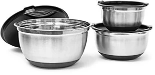 Ten 3- lub 4-częściowy zestaw misek ze stali nierdzewnej to idealne rozwiązanie, aby spełnić swoją pasję do gotowania lub pieczenia. Gumowa podstawa sprawia, że metalowe miski nie ślizgają się. Miski do gotowania sprawdzą się również jako miski do serwowania ponczu lub przekąsek na następnym przyjęciu. Aby zachować aromat i smak świeżo przygotowanego dania, pokrywka chroniąca przed aromatem jest bardzo pomocna. Dzięki praktycznym pokrywkom pojemniki do przechowywania żywności mogą być również używane jako uniwersalne pudełka do przechowywania.