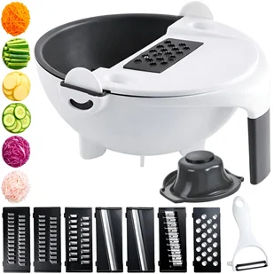 Miska kuchenna wielofunkcyjna 9w1 Jedno narzędzie, wiele możliwości w kuchni Wielofunkcyjna krajalnica kuchenna 9w1 to praktyczne rozwiązanie, które ułatwia codzienne przygotowywanie posiłków. Umożliwia krojenie, szatkowanie, tarcie, plasterkowanie oraz odcedzanie warzyw i owoców – wszystko przy użyciu jednego zestawu. Manualna obsługa sprawia, że produkt jest wygodny, bezpieczny i niezależny od prądu. Najważniejsze cechy produktu