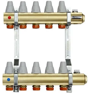 Rozdzielacz mosiężny z zaworami termostatycznymi i przepływomierzami, 5 obwodów Elementy zestawu: belka mosiężna nikiel x 2 z G1/2 zawór termostatyczny przepływomierz odpowietrznik półautomatyczny nikiel G1/2 korek mosiężny nikiel G1" nypel redykcyjny nikiel G1/2 x 3/4 szelka stalowa cynkowana x 2