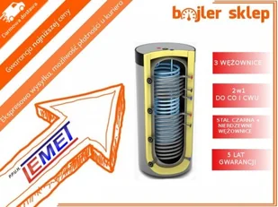 Zbiornik firmy Lemet o pojemności 600 litrów, z wężownicą nierdzewną do CWU oraz dwiema wężownicami do CO Model: 25. 600-2/5 Wysokość - 207 cm Średnica (z izolacją) - 81 cm Powierzchnia wężownicy CWU - 5,0 m2 Powierzchnia górnej wężownicy CO - 1,1 m2 Powierzchnia dolnej wężownicy CO - 1,9 m2 Charakterystyka zbiornika: trzy źródła zasilania - możliwość podłączenia takiego źródła ciepła jak: kocioł c. o, kominek z płaszczem wodnym, kolektory słoneczne itp. higieniczność dzięki zastosowaniu wężownicy wykonanej ze stali szlachetnej (atest do wody pitnej) duża wydajność dzięki zastosowaniu karbowanej wężownicy c.