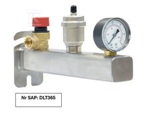 Grupa bezpieczeństwa z manometrem, zaworem bezpieczeństwa i automatycznym odpowietrznikiem ze stali nierdzewnej. Do instalacji CO.