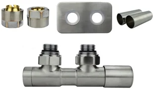 Komplet/zestaw z zaworem Twins regulacyjny przeznaczony jest do grzejników z połączeniem dolnym o rozstawie 50 mm. Przyłącze Twins reguluje przepływ wody i posiada funkcję odcięcia wody. GZ / GW . Zestaw zawiera: jedno przyłącze regulacyjne kątowe lewe lub prawe, jedną rozetę maskującą podwójną prostokątną, dwie tuleje maskujące oraz dwie złączki do instalacji PEX lub na miedź lub do instalacji 1/2 - złączki w jednej wersji do wyboru.