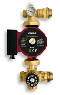 4-drogowy zawór termostatyczny z przyłączem 3/4" z regulacją temperatury wody grzewczej w zakresie 25-50°C Pompa obiegowa 25-40 130 mm (W0603) termometr 0-80°C ręczny zawór odpowietrzający Nadaje się do montażu na rozdzielaczach RZ i RZP w przypadku ogrzewania większych przestrzeni.