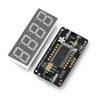 Moduł Adafruit Backpack wraz z 7-segmentowym wyświetlaczem składającym się z 4 cyfr z kropkami. Całkowita przekątna wyświetlacza wynosi 0,56", cyfry modułu posiadają niebieskie podświetlenie. Dzięki wbudowanemu układowi sterownika matrycy nie ma konieczności łączenia dużej ilości przewodów, całość sterowana jest za pomocą interfejsu I2C. Moduł wyposażony został dodatkowo w dwa złącza szybkiego łączenia - Qwiic / STEMMA QT. Na płytce można również znaleźć zworki do wyboru adresu I2C, dzięki czemu można łączyć ze sobą do ośmiu modułów wyświetlaczy 7-segmentowych. Moduł zasilany napięciem 3 V lub 5 V.
