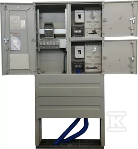Standard ENERGA, szafka pomiarowa, złącze kablowe - pomiarowe dla przyłączenia 2 instalacji, zasilane poprzez wcięcie magistralnej linii kablowej lub zasilanie pojedynczą linią kablową, w tym za pośrednictwem mufy rozgałęźnej z magistralnej linii kablowej. Wyposażenie przedziału złączowego: rozłącznik bezpiecznikowy skrzynkowy wielkości 00 z adapterem, umożliwiającym bezkońcówkowe przyłączenie dwóch kabli o przekroju do 150 mm2, adapter wyposażony w zaciski kablowe typu "V", szyna PEN wyposażona w dwa zaciski typu "V". Wyposażenie jednego przedziału pomiarowego: obudowa (kanał) do zabudowy zabezpieczenia przedlicznikowego (ogranicznika mocy), obudowa (kanał) z zabudowaną listwą 5x35 z imbusowymi śrubami zaciskowymi, tablica licznikowa TL-3f, przewody
