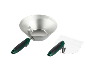 uchwyty: tworzywo sztuczne, paca: aluminium; odpórka na dłoń: PP Wymiary zestaw tynkarski: kielnia: ok. Ø 18 x wys. 11 cm; paca: