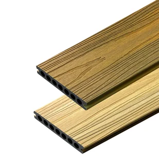 Deska Tarasowa Kompozytowa Premium Złoty Dąb / Dąb Miodowy Deska Kompozytowa Premium II generacji to produkt, który łączy w sobie wyjątkową jakość z nowoczesnym designem. Dzięki zaawansowanej technologii produkcji, deska ma charakterystyczną strukturę naturalnego usłojenia drewna. Deska jest dwustronna – można ją zamontować w zależności od preferencji. Wykorzystując nowoczesną technologię produkcji, deska posiada charakterystyczną strukturę, przypominającą naturalne usłojenie drewna. Dodatkowo konstrukcja wewnętrzna deski jest dużo sztywniejsza i bardziej wytrzymała na uszkodzenia mechaniczne dzięki zastosowaniu specjalnego przekroju okrągłych komór i kompozytu wysokiej gęstości.