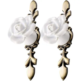 Dwie zabytkowe ceramiczne gałki do szafek z motywem kwiatowym, uchwyty do drzwi w kształcie róży, uchwyty do szafek kuchennych (dł.