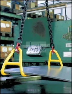 Uchwyt do podnoszenia pojedynczych blach lub pakietów w poziomie. Wymaga dodatkowego osprzętu w postaci zawiesi łańcuchowych lub linowych. Powierzchnia haków, na której leży blacha jest rowkowana. Udźwig podawany dla jednego uchwytu. Kąt między cięgnami zawiesia 30st.