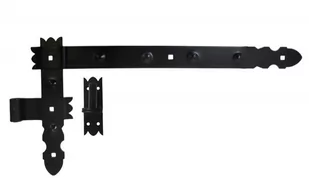 Ozdobny zawias kątowy z hakiem w rustykalnym stylu. Malowany proszkowo na czarno. Wymiary do pobrania w pliku pdf. Polecamy!