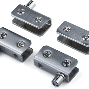 Zestaw 4 zawiasów odpowiednich do szkła o grubości 5-8 mm, wystarczających do montażu szafki dwudrzwiowej.