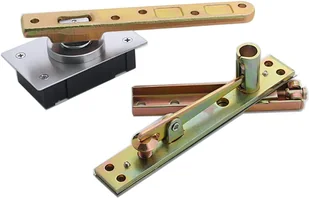 Mocuje się go nad i pod drzwiami, a położenie łożyska można regulować za pomocą śrub. (Uwaga: Zawias ten montuje się pośrodku górnej i dolnej krawędzi drzwi obrotowych.)