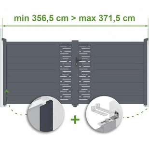 Umożliwia dopasowanie bramy do Twojej przestrzeni Nadaje się do przestrzeni od 351,5 do 371,5 cm 2 zawiasy XL do regulacji szerokości instalacji 2 panele maskujące do ukrycia pustej przestrzeni