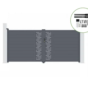 Ten zestaw bram z napędem zawiera:Brama skrzydłowa designerska ARLBERG w kolorze szarymSzerokość 350 cm, wysokość 161 cmNapęd ślimakowy (do 400kg)Casanoov specjalizuje się w bramach i furtkach KIT do samodzielnego montażu i samodz