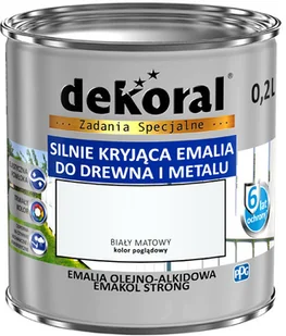 DEKORAL EMAKOL STRONG BIAŁY MATOWY 0,2l Dane techniczne: wygląd powłoki - mat ilość warstw 1-3 nanoszenie drugiej warstwy po 17 h sposób nanoszenia - pędzel, wałek lub natrysk wydajność przy jednej warstwie do 18 m2 Najważniejsze cechy: Elastyczna powłoka Łatwe zmywanie plam i zabrudzeń Trwała biel/trwały kolor Bardzo dobre krycie ** 6 lat ochrony * Krótki opis: Emalia olejno-alkidowa ogólnego stosowania przeznaczona jest do malowania przedmiotów z drewna, materiałów drewnopochodnych oraz elementów stalowych i żeliwnych (po wcześniejszym zagruntowaniu podkładem antykorozyjnym) eksploatowanych wewnątrz i na zewnątrz pomieszczeń (takich jak: okna, drzwi, meble, lamperie, ogrodzenia itp.). Polecana jest do stosowania w budynkach mieszkalnych oraz użyteczności publicznej, w tym obiektach służby zdrowia, oświatowo-wychowawczych oraz branży spożywczej (bez bezpośredniego kontaktu z żywnością).