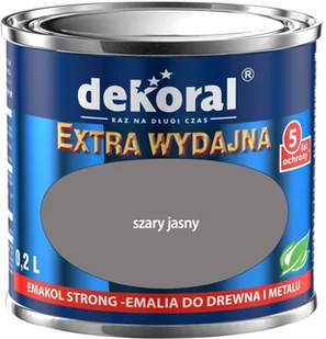 DEKORAL EMALIA EMAKOL STRONG SZARY JASNY POŁYSK 0,2 L Dane techniczne: wygląd powłoki - połysk, mat ilość warstw 1-3 nanoszenie drugiej warstwy po 17 h sposób nanoszenia - pędzel, wałek lub natrysk wydajność przy jednej warstwie do 18 m2 Najważniejsze cechy: Elastyczna powłoka Łatwe zmywanie plam i zabrudzeń Trwała biel/trwały kolor Bardzo dobre krycie ** 6 lat ochrony * Krótki opis: Emalia olejno-alkidowa ogólnego stosowania przeznaczona jest do malowania przedmiotów z drewna, materiałów drewnopochodnych oraz elementów stalowych i żeliwnych (po wcześniejszym zagruntowaniu podkładem antykorozyjnym) eksploatowanych wewnątrz i na zewnątrz pomieszczeń (takich jak: okna, drzwi, meble, lamperie, ogrodzenia itp.). Polecana jest do stosowania w budynkach mieszkalnych oraz użyteczności publicznej, w tym obiektach służby zdrowia, oświatowo-wychowawczych oraz branży spożywczej (bez bezpośredniego kontaktu z żywnością).