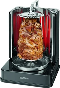 Pionowy multigrill do kebaba do beztłuszczowego grillowania np. kurczaka, kebabów/gyrosów lub szaszłyków mięsnychZe względu na pionową pozycję, wyciekające soki kapią bezpośrednio do tacki na tłuszcz ze stali nierdzewnejW zestawie 1 rożen obrotowy (duży) np. do kurczaka lub kebabów/gyrosówW zestawie 6 oddzielnie obracających się szpikulców do mięsa (małe)W zestawie szczypce ze stali nierdzewnejWłącznik/wyłącznikLampka kontrolna220-240 V, 50/60 Hz, 1400 W Dzięki wydajnemu urządzeniu Bomann Multigrill 3w1 możesz cieszyć się smacznymi przysmakami, takimi jak pikantne kebaby/gyros, chrupiący grillowany kurczak lub aromatyczny szaszłyk mięsny w dowolnym momencie we własnych czterech ścianach. Dzięki obracającemu się centralnemu rożnowi, pyszne specjały z grilla są gotowe w mgnieniu oka. 6dodatkowych szpikulców (małych) idealnie nadaje się do szaszłyków, ryb lub warzyw, apionowa pozycja pozwala sokom kapać bezpośrednio do kolektora tłuszczu ze stali nierdzewnej, co zapewnia beztłuszczowe, zdrowe grillowanie i łatwe czyszczenie.