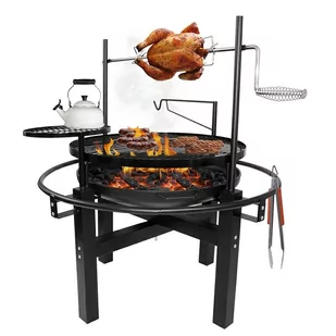 trawnika. Rożen dołączony do zestawu ustawiony na stabilnej konstrukcji umożliwia pieczenie potraw bezpośrednio nad ogniem lub żarem z węgla. Specyfikacja: dodatkowy mały ruszt (np. do gotowania) stalowy rożen z rączką umożliwiającą obracanie pieczonej potrawy wymiary paleniska: 59x59x12cm średnica rusztu: 62cm grubość blachy: