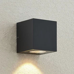 Lampa zewnętrzna ścienna LED Tassnim z optyką sześcianu w kolorze grafitowym Lampa zewnętrzna ścienna LED reprezentuje stylowe i nowoczesne wzornictwo. Jej korpus przypomina kostkę i jest wykonany z aluminium w kolorze grafitowym. Wewnątrz znajduje się zamontowana na stałe LED, która wytwarza światło o barwie ciepłej bieli i tym samym zapewnia odpowiednią atmosferę. Dzięki stopniowi ochrony IP65 lampa jest pyłoszczelna i zabezpieczona przed strumieniem wody, co czyni ją idealną do instalacji na zewnątrz. Kompaktowy i dyskretny wygląd bez trudu integruje się ze stylem architektonicznym i dlatego jest idealny do montażu na ścianie zewnętrznej.