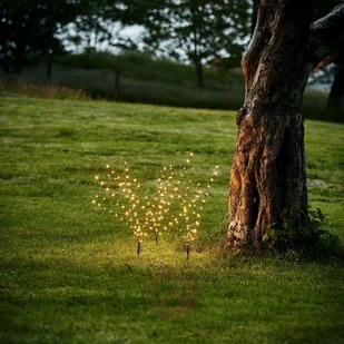 Lampa dekoracyjna LED Reedy w jeździecce z kolcem ziemnym Reedy jest zaprojektowany w kształcie gałęzi drzewa z drobnymi gałęziami, które są pokryte indywidualnymi diodami LED w odstępach 5 cm. Zarówno latem, jak i zimą, zestaw z trzema okazami jest mile widzianym akcentem w łóżku lub trawniku. Te trzy elementy są połączone ze sobą w odległości 50 cm i można je łatwo wsunąć w ziemię za pomocą szpilki uziemiającej.