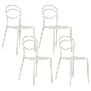Krzesła do domu i ogrodu. Ten zestaw 4 krzeseł bez podłokietników to praktyczne rozwiązanie, które sprawdzi się zarówno w domu, jak i w ogrodzie. Siedziska z wytrzymałego tworzywa oraz solidne, żelazne nogi gwarantują trwałość i odporność na warunki pogodowe, a przy tym zachowują prosty, minimalistyczny charakter. Dzięki uniwersalnemu designowi świetnie pasują do jadalni, a jednocześnie łatwo wkomponują się w każde wnętrze czy przestrzeń. Szczegóły: Typ produktu: