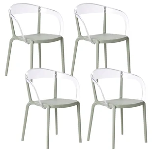 Cztery krzesła do jadalni lub ogrodu. Ten zestaw czterech stylowych krzeseł doskonale sprawdzi się zarówno w ogrodzie, jak i w jadalni. Wykonane z wytrzymałego, odpornego na warunki atmosferyczne materiału, krzesła są lekkie, stabilne i praktyczne dzięki możliwości sztaplowania. Nowoczesny design z przezroczystym oparciem i podłokietnikami oraz pastelowy kolor sprawiają, że z łatwością wpasują się w każdą aranżację. Szczegóły: Typ produktu: