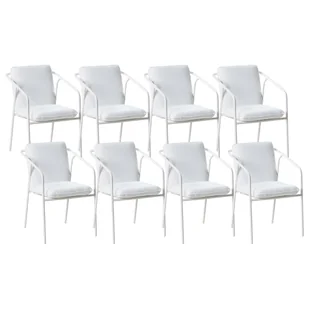 Osiem minimalistycznych krzeseł tarasowych. Ten zestaw 8 krzeseł ogrodowych łączy minimalistyczny design z wysoką funkcjonalnością. Solidna konstrukcja z metalu w białym kolorze jest malowana proszkowo, co zapewnia odporność na czynniki zewnętrzne. Krzesła są dostarczane z grubymi poduszkami, które zwiększają komfort korzystania. Dzięki możliwości sztaplowania, meble te są idealnym rozwiązaniem dla osób ceniących łatwe przechowywanie.