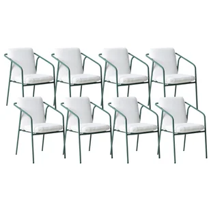Osiem minimalistycznych krzeseł tarasowych. Ten zestaw 8 krzeseł ogrodowych łączy minimalistyczny design z wysoką funkcjonalnością. Solidna konstrukcja z metalu w zielonym kolorze jest malowana proszkowo, co zapewnia odporność na czynniki zewnętrzne. Krzesła są dostarczane z grubymi białymi poduszkami, które zwiększają komfort korzystania. Dzięki możliwości sztaplowania, meble te są idealnym rozwiązaniem dla osób ceniących łatwe przechowywanie.