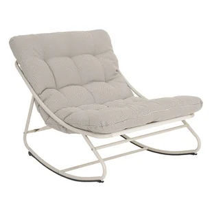 Fotel bujany Cloud marki Esti&Esta ma wysokość 69 cm, szerokość 78 cm i głębokość 107 cm. Głębokość siedziska wynosi 50 cm. Materiał konstrukcji to stal, a materiał siedziska i poduszki to poliester. Gramatura tkaniny wynosi 255 g/m², a maksymalne obciążenie fotela to 110 kg. Kolor siedziska jest beżowy, a kolor poduszki szaro-beżowy.