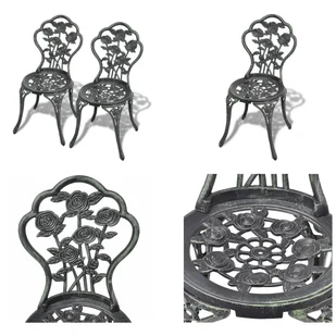Krzesła bistro 2 szt. Odlew aluminiowy zielonyTe krzesła bistro będą wspaniałym dodatkiem do Twojego patio lub ogrodu dzięki dekoracyjnym, kwiatowym detalom. Z przyjemnością zaserwujesz swoim przyjaciołom filiżankę kawy na tych krzesłach. Zestaw bistro wykonany jest z wysokiej jakości odlewu aluminiowego, który jest odporny na warunki atmosferyczne i bardzo trwały. Żeliwne nogi przyczyniają się do stabilności zestawu.