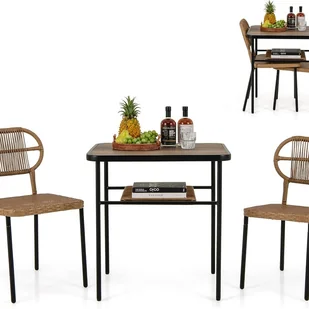 Ten 3-częściowy zestaw składa się z 2 krzeseł z wikliny o różnych rozmiarach, które nie tylko można ustawiać jedno na drugim, ale także schować pod stołem, gdy nie są używane. Krzesła mają eleganckie, odporne na słońce i trwałe plecionki z rattanu oraz ergonomiczne, pochylone oparcia zapewniające najwyższy komfort. Ponadto stół ma blat z DPC i praktyczną półkę do przechowywania pod spodem.