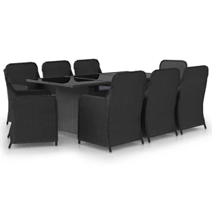 Uwaga: zalecamy przykrycie zestawu na czas deszczu, śniegu i mrozu. Stół: Kolor: czarny Materiał: rattan PE, szkło, stal malowane proszkowo Wymiary: 200 x 100 x 74 cm (dł. x szer. x wys.) Krzesło: Kolor: czarny Kolor poduszki: