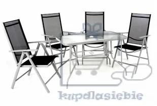 Lekkie, ale solidne połączenie stołu (z bezpiecznym szkłem) i 4 składanymi krzesłami jest bardzo wygodne. Ponadto stół jest wyposażony w otwór na parasol.