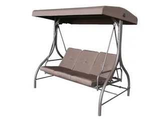 Luksusowa ławka ogrodowa z dachem, wykonana z rur stalowych z wykończeniem komaxit. Możliwość rozłożenia. Ławka zawieszona na sprężynach. Nadaje się do wewnątrz pomieszczeń ogrodowych i tarasów. Nie nadaje się do użytku w wilgotnych warunkach.