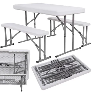 Komplet mebli bankietowych, składany stolik ogrodowy 2 ławki, biały