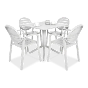 Meble Nardi PALMA/CLIP 4+1 Bianco zapewnią miejsce czterem dorosłym osobom, które mogą zjeść posiłek lub wypić kawę przy funkcjonalnym stole jadalnianym w komfortowych warunkach. Gorąco polecamy do przydomowego ogrodu i dla wszystkich właścicieli ogródków gastronomicznych i restauracji. Cechy produktu meble ogrodowe PALMA/CLIP 4+1 Bianco zaprojektowała włoska marka Nardi, która produkuje najlepsze meble z tworzywa w Europie cały zestaw wykonany jest z żywicy polipropylenowej, którą dodatkowo wzmocniono włóknem szklanym dla osiągnięcia maksimum trwałości zastosowane tworzywo ma na całym swoim przekroju jednolitą strukturę i kolor, nie traci więc barwy pomimo intensywnego użytkowania meble do restauracji PALMA/CLIP 4+1 Bianco oferują w komplecie 4 wygodne krzesła i bardzo praktyczny stół jadalniany nogi zakończone są antypoślizgowym tworzywem, co zapewnia bezpieczeństwo na mokrym tarasie, dodatkowo nogi stołu można poziomować w przypadku nierównego podłoża krzesła można nakładać jedno na drugie (sztaplować), co ma znaczenie wszędzie tam gdzie ważna jest oszczędność miejsca i mobilność stół jadalniany, dzięki specjalnemu projektowi nóg zapewnia jednocześnie stabilność i dużą swobodę ruchów dla osób siedzących zestaw ogrodowy został zaprojektowany pod kątem intensywnego użytkowania i wyróżnia się najwyższym współczynnikiem odporności na niepogodę i promieniowanie UV meble są bardzo łatwe do utrzymania w czystości, wystarczy zmyć je wodą z węża ogrodowego lub użyć wilgotnej ściereczki najwyższą jakości mebli ogrodowych Nardi potwierdza przyznany im przez instytut badawczy CATAS specjalny certyfikat który informuję, że przeprowadzone testy wytrzymałościowe rekomendują meble do użytkowania w dużych obiektach publicznych takich jak hotele, restauracje, aquaparki i inne ośrodki wypoczynkoweWymiary krzesło: szerokość - 59 cm, głębokość - 56,5 cm, wysokość - 86 cm stolik: długość - 80 cm, szerokość - 80 cm, wysokość - 75 cm