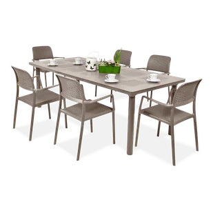 Meble ogrodowe Nardi BORA/LIBECCIO 6+1 Tortora - Meble BORA/LIBECCIO Nardi to doskonały zestaw ogrodowy jadalniany wykonany z najwyższej jakości 100% polipropylenu wzmacnianego włóknem szklanym. Przede wszystkim meble te zostały wyprodukowane przez włoską markę Nardi, która specjalizuje się w produkcji mebli ogrodowych klasy premium. To wszystko oznacza nic innego jak absolutnie topową jakość materiałów, włoską stylistykę i ultra wytrzymałość. Meble Bora/Libeccio są całkowicie obojętne na niepogodę, nie wymagają żadnych zabiegów impregnacji i mogą stać na zewnątrz przez okrągły rok. Komplet składa się z 6 bardzo wygodnych krzeseł oraz niezwykle funkcjonalnego, rozkładanego stołu.