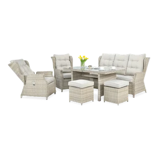 Opis: 6 mebli ogrodowych najwyższej jakości w jednym komplecie. Kupując zestaw technorattanowy Baltimore Dining Beige dostajesz 3-osobową sofę, 2 fotele z pł...