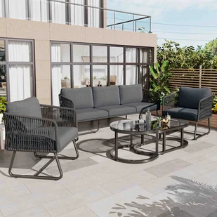Nadaj swojemu ogrodowi lub patio elegancki styl i wyjątkową funkcjonalność dzięki temu nowoczesnemu, 7-elementowemu zestawowi mebli ogrodowych. Zaprojektowany z myślą o komforcie i elegancji, zestaw zawiera 3-osobową sofę, dwa przestronne fotele i dwa eleganckie stoliki. Ocynkowana metalowa rama i grube poduszki zapewniają niezrównaną trwałość i komfort. Niezależnie od tego, czy relaksujesz się, czy delektujesz się swobodnymi posiłkami, ten zestaw spełni wszystkie Twoje oczekiwania.